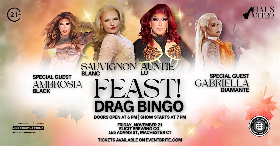 Friday, November 21 at 7 PMGet ready for a fun night of drag, bingo, and drinks at Elicit Brewing.Featuring Sauvignon Blanc, Auntie Lu, Ambrosia Black, and Gabriella Diamante.Doors open at 6 PM, show starts at 7 PM.