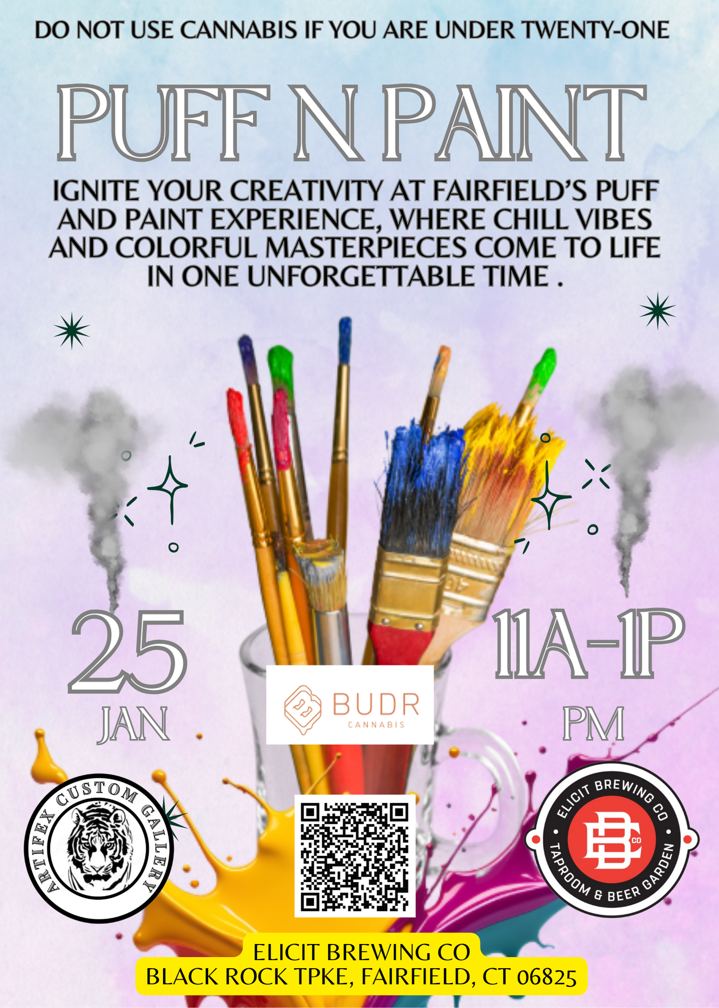 Puff N Paint is a guided paint event featuring a relaxed, creative atmosphere where guests can enjoy painting their own artwork with all supplies provided. This 21+ experience is designed for a chill afternoon of creativity, color, and good company.