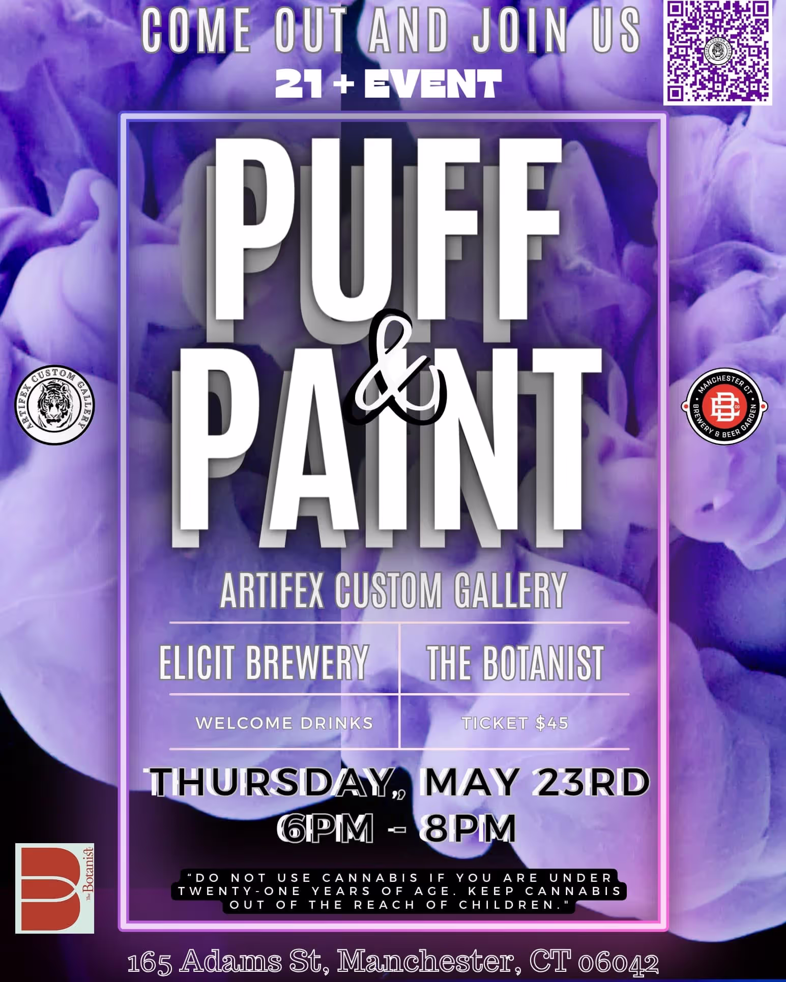 Welcome to Puff and Paint! Join us for a fun-filled evening of creativity and relaxation at Elicit Brewing Co - Manchester. Grab your friends and unleash your inner artist while enjoying some delicious brews. No experience necessary - our talented instructors will guide you every step of the way. Let your creativity flow as you paint your masterpiece. Don't forget to bring your favorite puff to enhance your artistic inspiration. Come unwind, socialize, and create something beautiful with us at Puff and Paint! This is a BYOC event. "Do not use cannabis if you are under twenty-one years of age. Keep cannabis out of the reach of children"