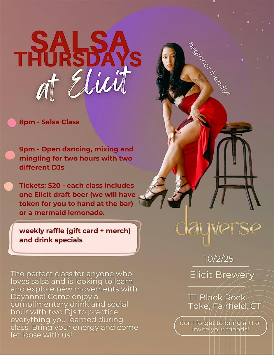 The people spoke and we listened! Dayanna's salsa classes have spiked interest and inspired people to expand their salsa skills and sharpen them. Its an opportunity to meet people, learn a new skill, and immerse yourself in culture that has so much to offer! Come enjoy Elicits yummy bites, drinks, and fun atmosphere with some friends!